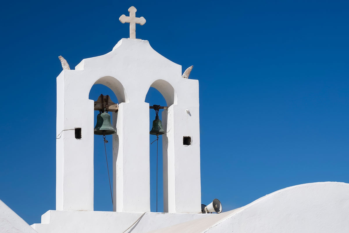 Whitewashed walls and bell tower of small orthodox church. Naxos island. Greece